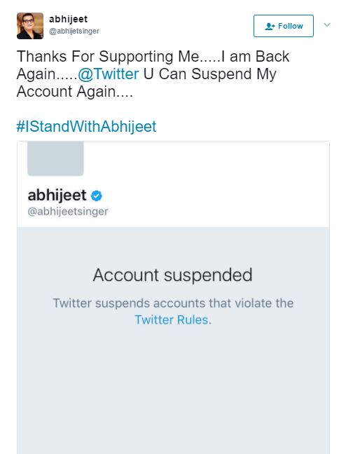 Last night, singer Abhijeet Bhattacharya’s Twitter account was suspended. Well, we all know that this was done because of his nasty tweets towards people, and spreading communal hatred in the form of tweets that were quite strong in language. However, it looks like the singer is in no mood to leave the micro-blogging site.