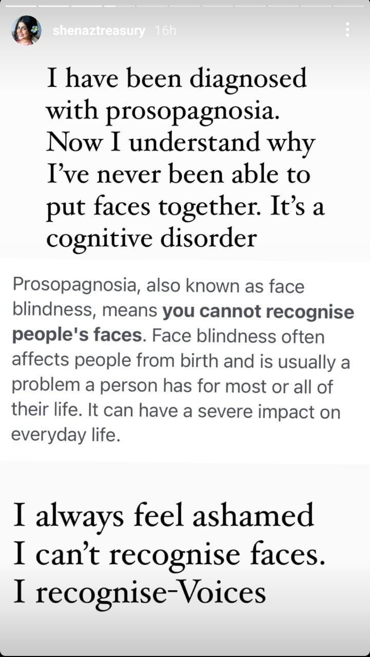 Shenaz Treasury in a lengthy note on Instagram wrote, that she used to have issues remembering peoples’ faces but remembered them by their voices.