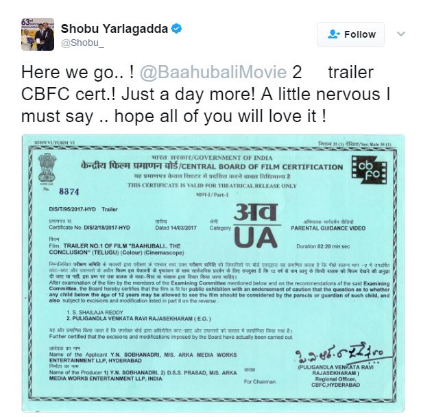 One of the producers of the film, Shobu Yarlagadda took to Twitter to make the announcement. He tweeted, “Here we go.. ! @BaahubaliMovie 2 trailer CBFC cert.! Just a day more! A little nervous I must say .. hope all of you will love it !” [sic]