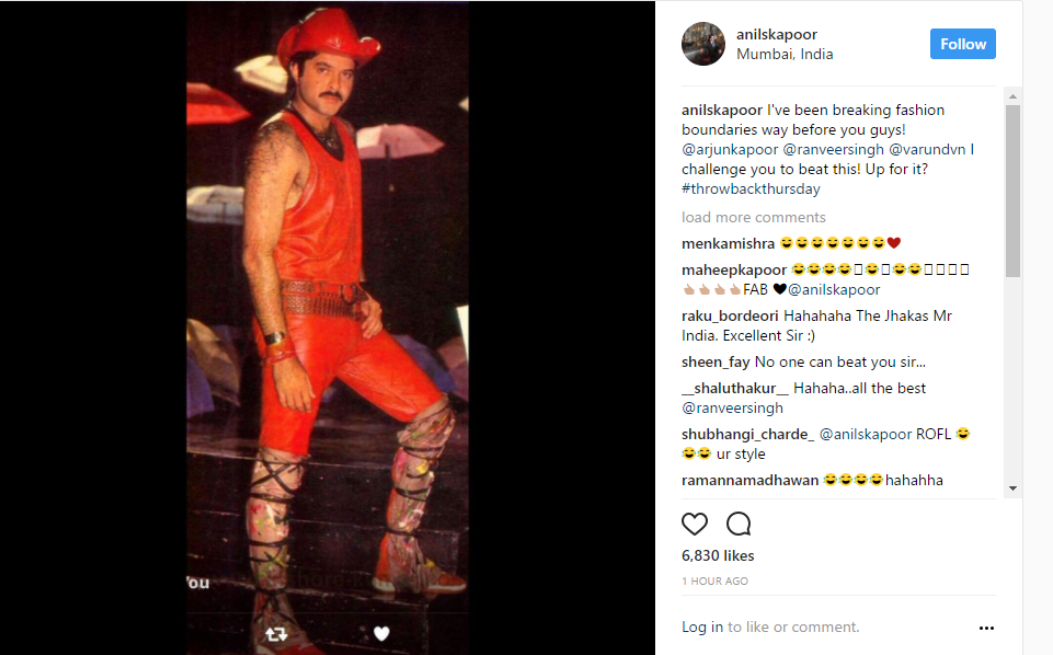 It so happened that Anil Kapoor recently shared a throwback picture of himself wherein we can see him wearing red leather shorts teamed with bright red leather ganji. Cherry on the cake is the red cowboy hat. What a style statement he has made! And not just this, Anil Kapoor has also challenged the new age boys viz. Arjun Kapoor, Varun Dhawan and Ranveer Singh to try and surpass him in the fashion game.