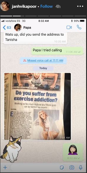 So, this is all because of one WhatsApp chat between the father-daughter duo. As we all know, Janhvi is a fitness enthusiast and goes to the gym regularly to keep her body in shape. Boney in this WhatsApp chat sent Janhvi a newspaper cutting, which says ‘do you suffer from exercise addiction?’ In the article, it was mentioned that by working out excessively, it can have an adverse effect on your health.