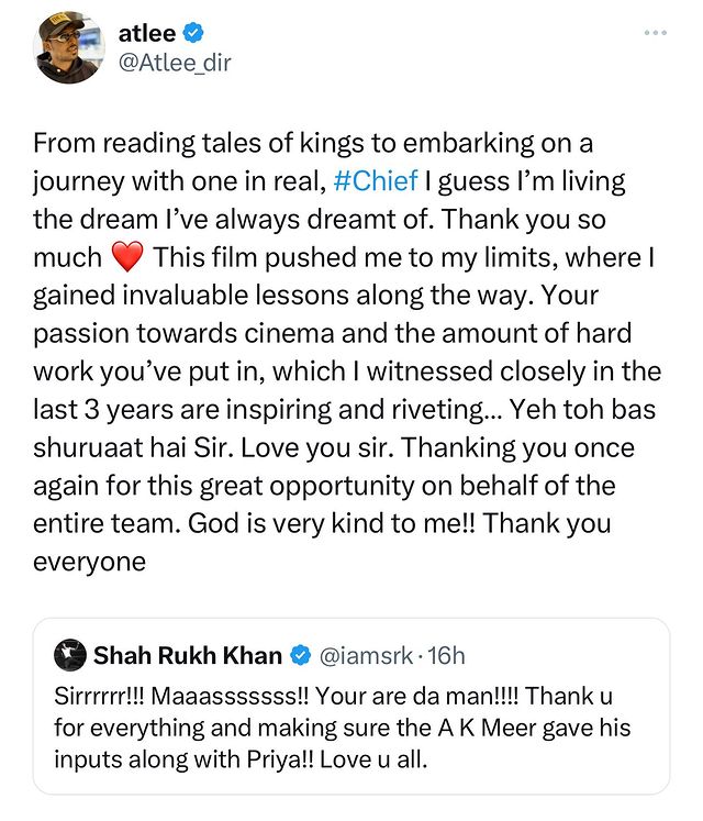 Atlee took to Twitter and also Instagram saying, “From reading tales of kings to embarking on a journey with one in real, #Chief I guess I’m living the dream I’ve always dreamt of. Thank you so much (heart emoji). This film pushed me to my limits, where I gained invaluable lessons along the way. Your passion towards cinema and the amount of hard work you’ve put in which I witnessed closely in the last 3 years are inspiring and riveting…Yeh toh bass shuruaat hai Sir. Love you sir. Thanking you once again for this great opportunity on behalf of the entire team. God is very kind to me!! Thank you everyone.”