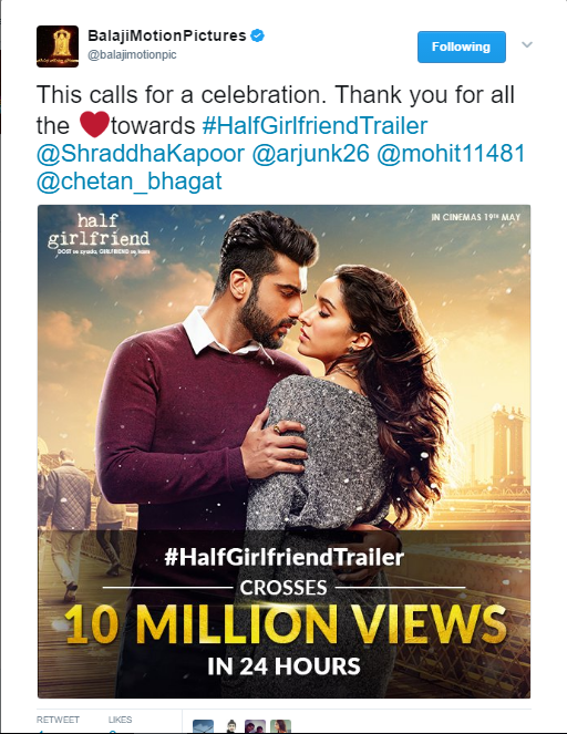 Yes! In fact, within 24 hours, the trailer of ‘Half Girlfriend’ has achieved a milestone by acquiring 10 million views. Balaji Motion Pictures, the production house of this film, shared the news through their Twitter handle.