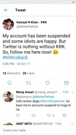 In the past too, the man has disrespected many actresses and even bashed movies left, right and centre for no reason. This had to happen one day and it did! However, his other box office page which is verified on Twitter has been tweeting, “This is a black mailing by @Twitter if they have suspended account of @kamaalrkhan withut abusing anybody. They didn’t give any warning also”, “Pls note @Twitter ppl, u can’t stop @kamaalrkhan from giving reviews of films or saying hit n flop about films. His review come on #Youtube”, and “We want to inform to all the media that @kamaalrkhan won’t open any new account on @Twitter so if anyone is claiming that is fake account.”