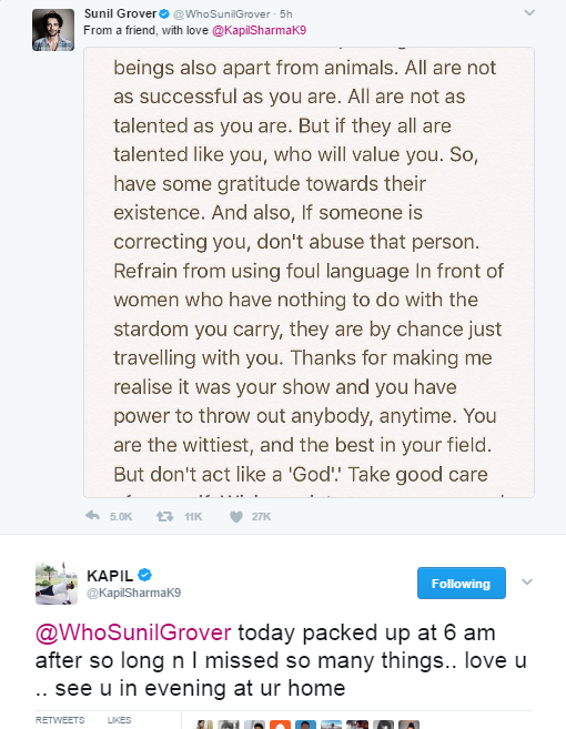 Sunil kept mum for quite a while, but today morning, he wrote back to Kapil on Twitter and stated that he should stop acting like God and should treat everyone well. This was followed by various tweets from Kapil Sharma and in one of the tweets he has mentioned that he would be visiting Sunil at his residence in the evening. Reports also have it that Sunil has quit the show and is in no mood to get back to Kapil.