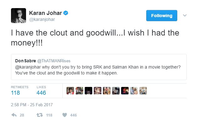 To which Karan replied, “I have the clout and goodwill…I wish I had the money!!!”