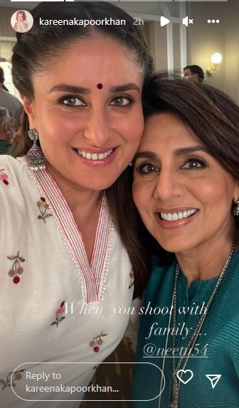 On Monday, Actor Kareena Kapoor Khan took to her Instagram stories and dropped some lovely selfies with none other than her aunt and veteran star Neetu Kapoor. Sharing the pictures with her fans, Kareena announces that she is shooting with her aunt Neetu Singh. In the pictures, we see Kareena and Neetu flashing their happy smiles as they pose for a selfie. Captioning the picture, Bebo writes, “When you shoot with family.”