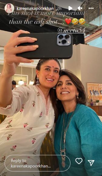 Sharing another selfie from their work diaries, Kareena writes, “This shot is more important than the asli shot,” adding a heart emoji and a few LOL emojis. Kareena signs off by sharing a picture of her and Neetu Kapoor digging into a meal, along with make-up artist Mickey Contractor. She captions it, “And then of course the food.” Neetu Kapoor re-posts Kareena’s Instagram stories and writes, “Love her.”