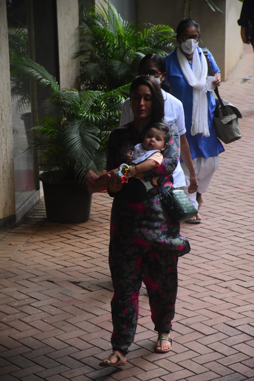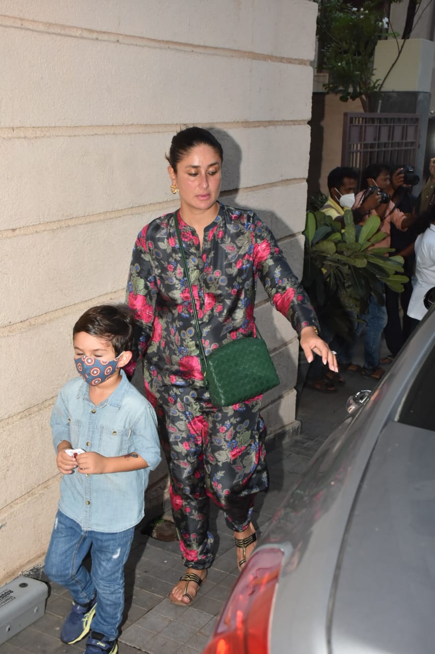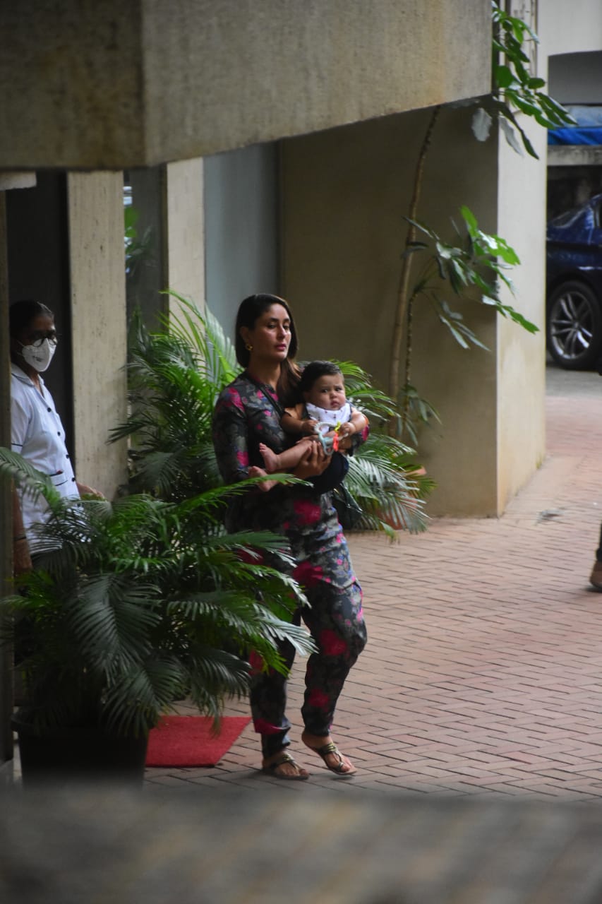 In the pictures, Kareena is spotted holding baby Jeh in her arms. The little one is sitting comfortably, as his mom carries him around. Kareena Kapoor looked badass as she wrapped around a chic green leather sling bag around her waist. For her outing, the actress opted for a Salwar Kurta set in green with intricate floral print. She completed her look with black Kolhapuri sandals and left her tresses open.
