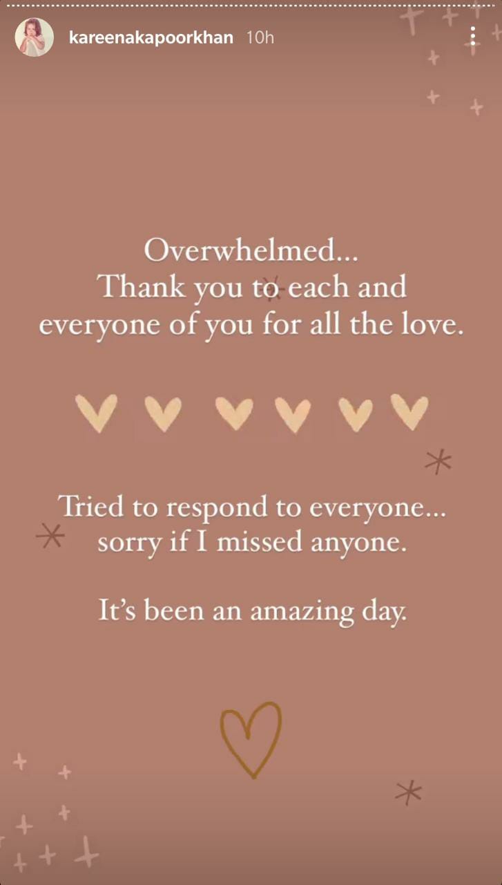 In the sweet thank you note, Kareena Kapoor Khan wrote, “Overwhelmed… Thank you to each and everyone of you for all the love. Tried to respond to everyone… Sorry if I missed anyone. It’s been an amazing day. (sic)”