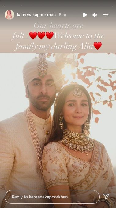 Actor Kareena Kapoor Khan is all hearts as she just welcomed the new Bahu Alia Bhatt into the Kapoor family after she got married to Ranbir Kapoor. After Alia releases the first dreamy wedding photos on Instagram, Kareena also shared one picture on her Instagram stories and expressed her happiness of having Alia as her sister-in-law. Sharing the picture with her fans, Kareena called Alia her darling. In the picture, Bebo captioned it as, “Our hearts are full, welcome to the family Alia”. Kareena attended the Ranbir Kapoor and Alia Bhatt wedding with Saif Ali Khan and their kids Taimur Ali Khan and Jeh Ali Khan.