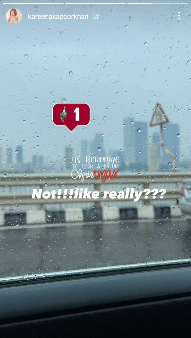 Taking to her Instagram, Kareena shared a picture of her car window that has a few droplets of water. The actress gave a glimpse of the rainy day in Mumbai. Kapoor made the post, shared the picture, and added a gif that read “It becoming to look a lot like Christmas“. The actress continued, “Not!!! really??” She expressed how it is the Christmas month, however, it is raining in Mumbai, rather than snowing.