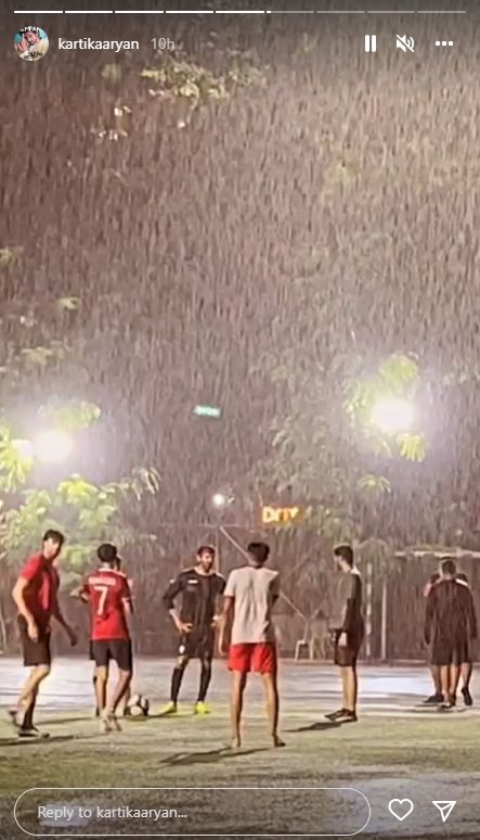 Kartik Aaryan took to his IG stories and shared a number of pics and videos of his game in the rain. He wrote: “Time for some football and swimming.” The actor shared one more video captioned as “Catch me if you can” with a running emoji.