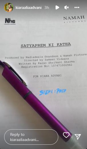 Actor Kiara Advani is once again reuniting with her Bhool Bhulaiyaa 2 co-star Kartik Aaryan for the upcoming movie, Satyaprem Ki Katha. The actor took to her Instagram stories and announced that she has begin her prep for the film as she gives us a glimpse of the script. Sharing the screenplay with her fans, Kiara captioned, “Step 1: Prep”.