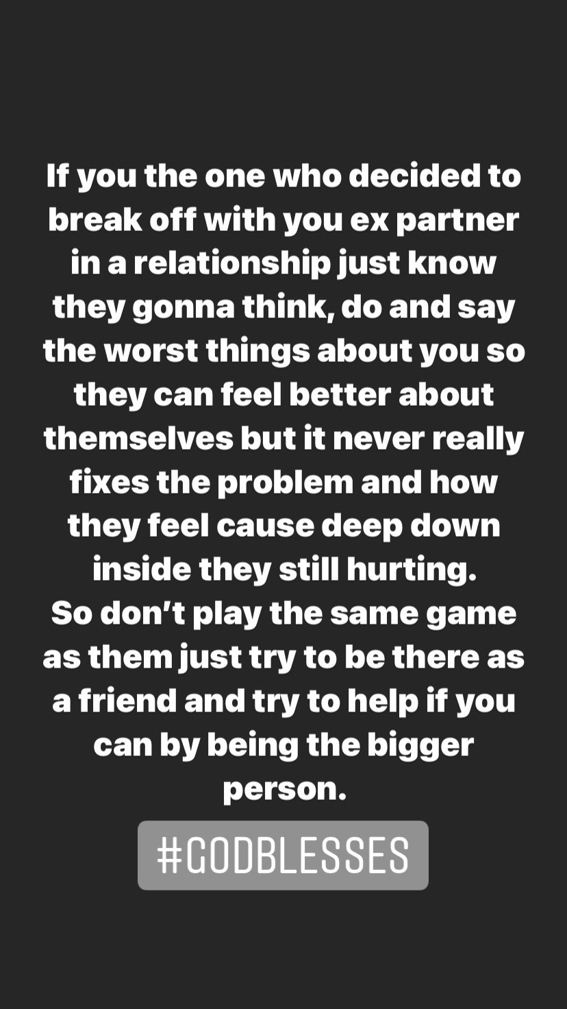 Eban in his cryptic post, even without naming anyone, has opened up about how one should stay gracious even if one’s ex is badmouthing them in front of the whole world. Eban wrote, “If you the one who decided to break off with you ex partner in a relationship just know they gonna think, do and say the worst things about you so they can feel better about themselves but it never really fixes the problem and how they feel cause deep down inside they still hurting. So don’t play the same game as them just try to be there as a friend and try to help if you can by being the bigger person. #GODBLESSES (sic).” Have a look: