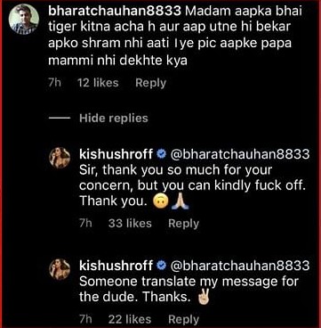 Now commenting on Krishna’s post a troll wrote, “Madam aapka bhai tiger kitna acha h aur aap utne hi bekar apko shram nhi aati ye pic aapke papa mammi nhi dekhte kya (Madam, you are as worthless as your brother is amazing. Do you have no shame? Don’t your parents see your pictures)?”