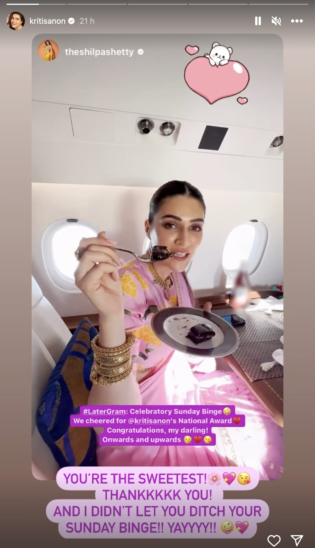 Shilpa shared glimpses of it on her Instagram stories and wrote, “#Latergram: Celebratory Sunday Binge (tongue sticking out, winking eye emoji) We cheered for Kriti Sanon’s National Award (red heart emoji) Congratulations, my darling. Onwards and Upwards (partying face, red heart, kissing heart emojis)”.