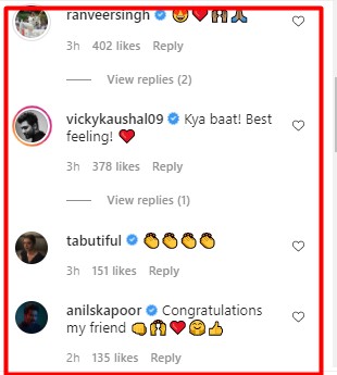 Several celebs like Ranveer Singh, Tabu, Vicky Kaushal and Anil Kapoor reacted on Kunal’s post. They all congratulated him.