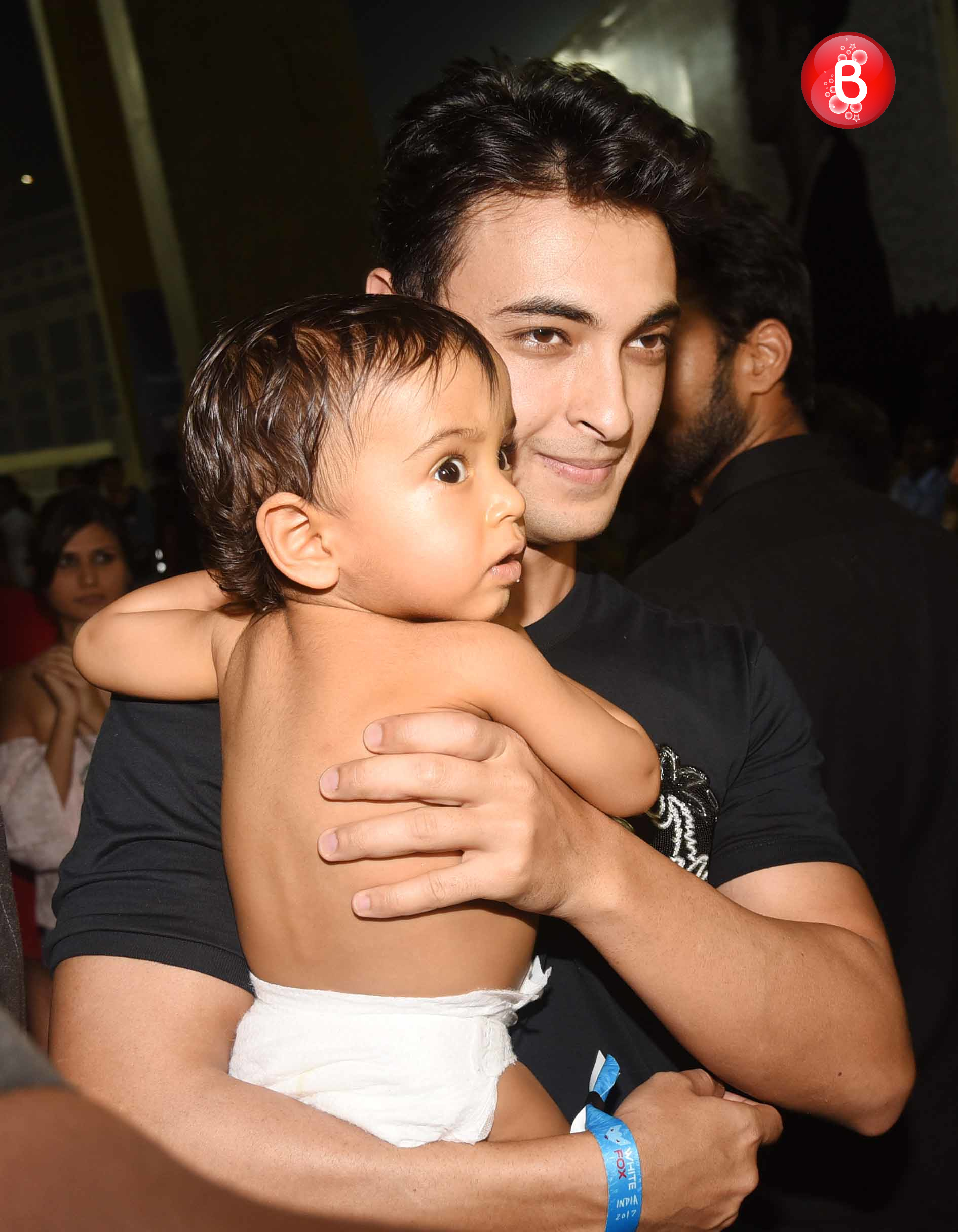 Baby Ahil accompanied his parents Aayush Sharma and Arpita Khan Sharma to the concert and was his adorable best as always. Our shutterbugs managed to capture him through their lens and at one point he was shirtless too! We know how much his mamu Salman Khan likes going shirtless and showing off his chiseled chest. Well, looks like cutey Ahil is following into his mama’s footsteps already! But surely, Ahil is a step ahead. Not just his shirt, Ahil went pant-less too! The little munchkin was simply spotted in his diaper, residing nicely in his father’s arms! (Also Read:Â Fashion Tour! Know what your favourite celebs wore at the Justin Bieber concert!)