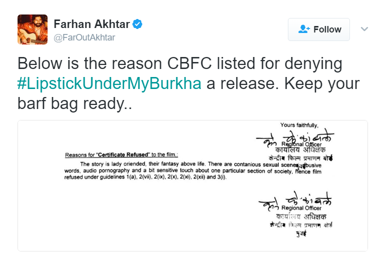 Producer Prakash Jha and director Alankrita Shrivastava were informed by the CBFC that they cannot certify the movie with the reason: “The story is lady oriented, their fantasy above life. There are contentious sexual scenes, abusive words, audio pornography and a bit sensitive touch about one particular section of society, hence film refused under guidelines 1(a), 2(vii), 2(ix), 2(x), 2(xi), 2(xii) and 3(i).”