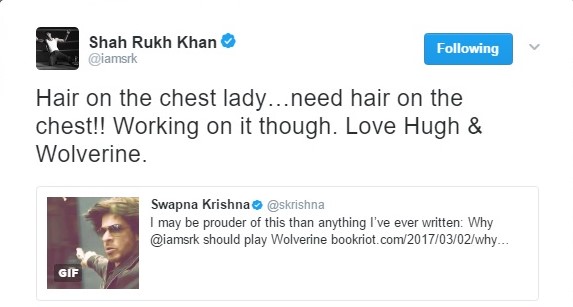 It was recently that Hollywood actor Hugh Jackman expressed his desire to see Shah Rukh Khan take forward the legacy of playing his popular character ‘Wolverine’ on screen. The article on the same was tweeted by one of Shah Rukh’s fans recently. The actor, however, said that he would first need hair on the chest to look convincing. (Also Read: Is that Shah Rukh Khan in turban on the sets of Imtiaz Ali’s next?)