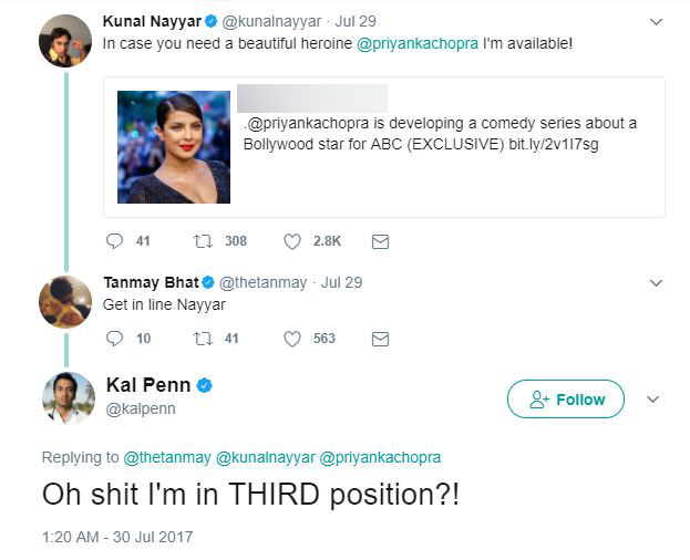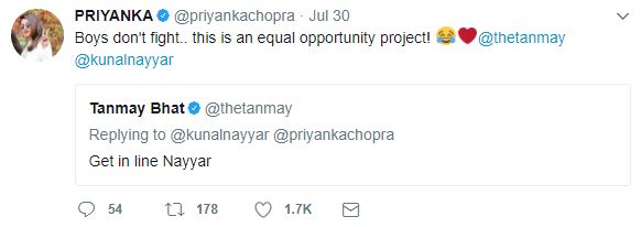 Well, PeeCee then also took to Twitter to reply them. She posted, “Boys don’t fight.. this is an equal opportunity project! ?❤️@thetanmay @kunalnayyar.”