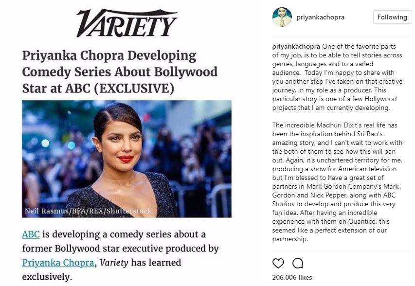 Priyanka posted, “One of the favorite parts of my job, is to be able to tell stories across genres, languages and to a varied audience. Today I’m happy to share with you another step I’ve taken on that creative journey, in my role as a producer. This particular story is one of a few Hollywood projects that I am currently developing. The incredible Madhuri Dixit’s real life has been the inspiration behind Sri Rao’s amazing story, and I can’t wait to work with the both of them to see how this will pan out. Again, it’s unchartered territory for me, producing a show for American television but I’m blessed to have a great set of partners in Mark Gordon Company’s Mark Gordon and Nick Pepper, along with ABC Studios to develop and produce this very fun idea. After having an incredible experience with them on Quantico, this seemed like a perfect extension of our partnership.”