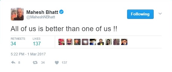 He later tweeted, “All of us is better than one of us !!”