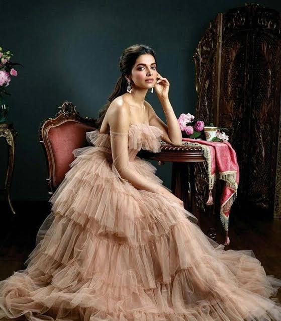 Donning a nude-pink coloured ruffles themed gown, the actress in the picture stares into a distance like a disappointed princess. Also, matching her outfit with the same nude-pink pout, she looks divine.