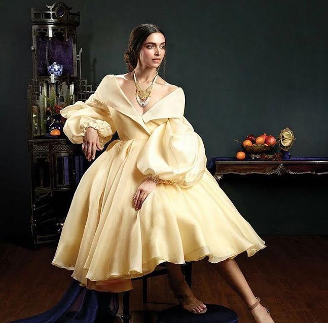 Parking her toned butt on a cushion and posing in a lovely cream coloured off-shoulder ball gown, Deepika takes our breath away! Her middle parted bun, classic necklace and those strappy heels, just perfectly blend her overall getup.