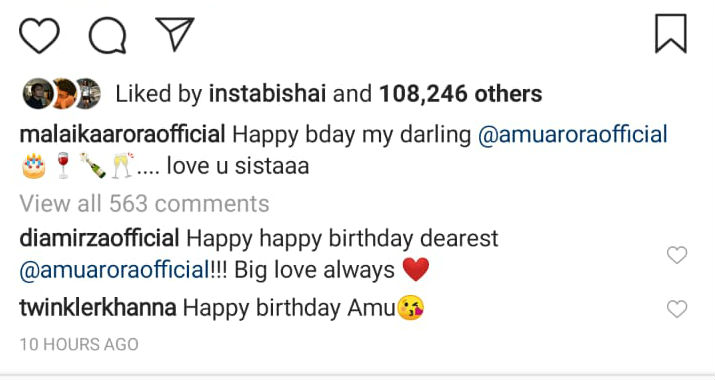 Malaika was soon followed by her ex-husband Arbaaz Khan who shares a great bond of friendship with his ex-sister-in-law Amrita Arora. He took to his Instagram handle and wished his partner in crime.