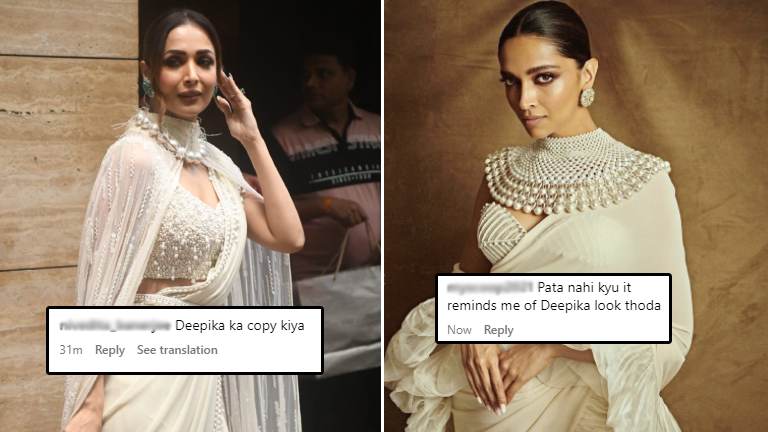 The saree was teamed with a beautiful pearl blouse and we honestly, couldn’t take our eyes off her. Malaika Arora added a heavy pearl choker to enhance her look a notch higher. Opting for subtle makeup and her hair back in a bun, Malaika looked like a vision in white. However, there are some who thought her look was quite similar to Deepika Padukone’s.