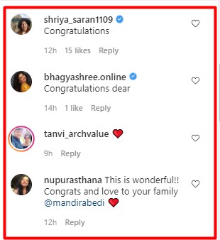 Several B-town celebs flooded the above post’s comment section with love. Actresses like Shriya Saran and Bhagyashree congratulated Mandira.