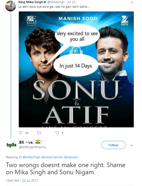 Mika, immediately took to Twitter to announce that other renowned singers Atif Aslam and Sonu Nigam were performing in the same concert as well. It only made the matter worse!