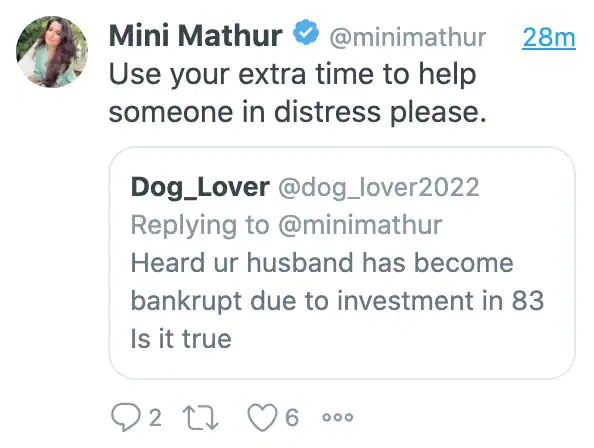 Commenting on Mini’s post, a nasty troll wrote, “Heard ur husband has become bankrupt due to investment in 83. Is it true?” Replying to the troll, the actress-VJ wrote, “Use your extra time to help someone in distress please(sic).”