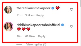 Bebo’s sister Karisma Kapoor and cousin Riddhima Kapoor Sahni left heart emojis in the comment section of her post.