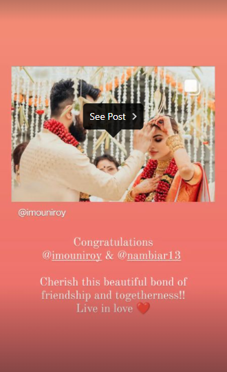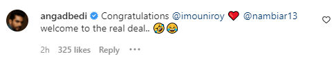 Angad Bedi: “Congratulations @imouniroy ❤️ @nambiar13 welcome to the real deal.. ??”
