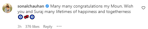 Sonal Chauhan: “Many many congratulations my Moun. Wish you and Suraj many lifetimes of happiness and togetherness ???”