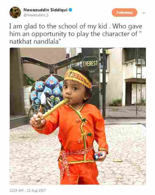 The actor took to his Twitter handle to share this picture with everyone and has captioned it as, “I am glad to the school of my kid . Who gave him an opportunity to play the character of “natkhat nandlala“.” [sic] (Also Read: Nawazuddin Siddiqui is all set to release his autobiography soon)