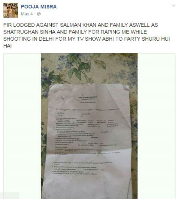 Apparently, Pooja lodged a complaint against Salman Khan and Shatrughan Sinha and even shared a copy of it on Facebook, “FIR LODGED AGAINST SALMAN KHAN AND FAMILY AS WELL AS SHATRUGHAN SINHA AND FAMILY FOR RAPING ME WHILE SHOOTING IN DELHI FOR MY TV SHOW ABHI TOH PARTY SHURU HUI HAI.”