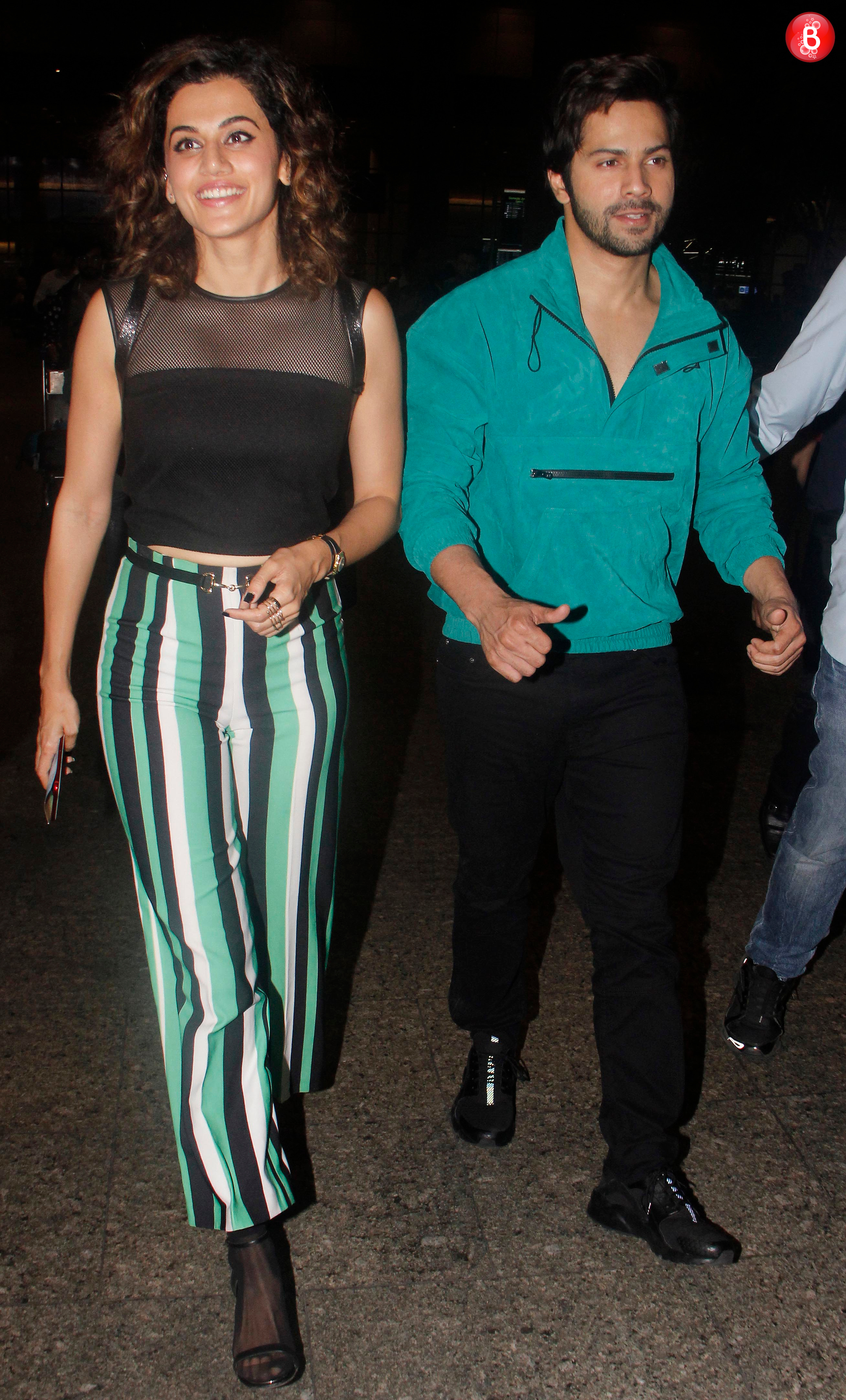 The ‘Judwaa 2’ actors were seen colour-coordinating at the Mumbai airport. Both Varun and Taapsee chose black and green outfits as they returned from Jaipur. While the actress slipped into this black top with green, white and black striped pants, Dhawan opted for a smart green hoodie with black denims. But there’s one thing that’s been haunting us. It’s the lady’s socks she’s worn underneath her sandals. Why would anyone do that unless you are shielding yourself from cold weather?