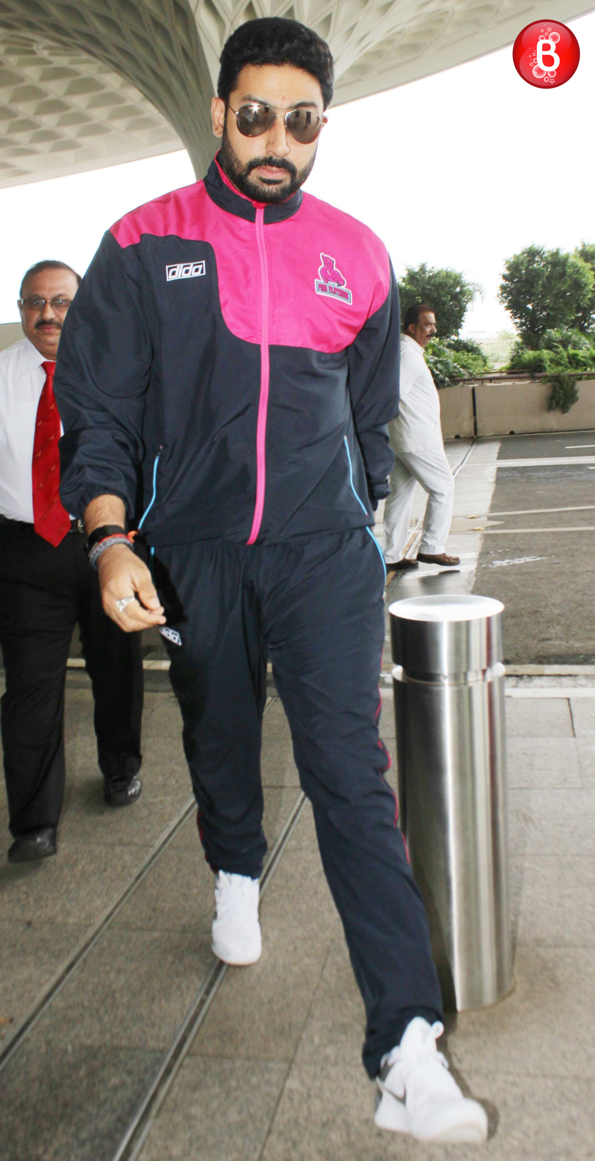 Abhishek has been busy prepping up for the new season of Pro Kabaddi League and was spotted while taking off to Jaipur. He looked dapper in this stylish Jaipur Pink Panthers' track suit that he clubbed with white sneakers and black sunnies. We totally loved this avatar of Jr.Bachchan. How about you?
