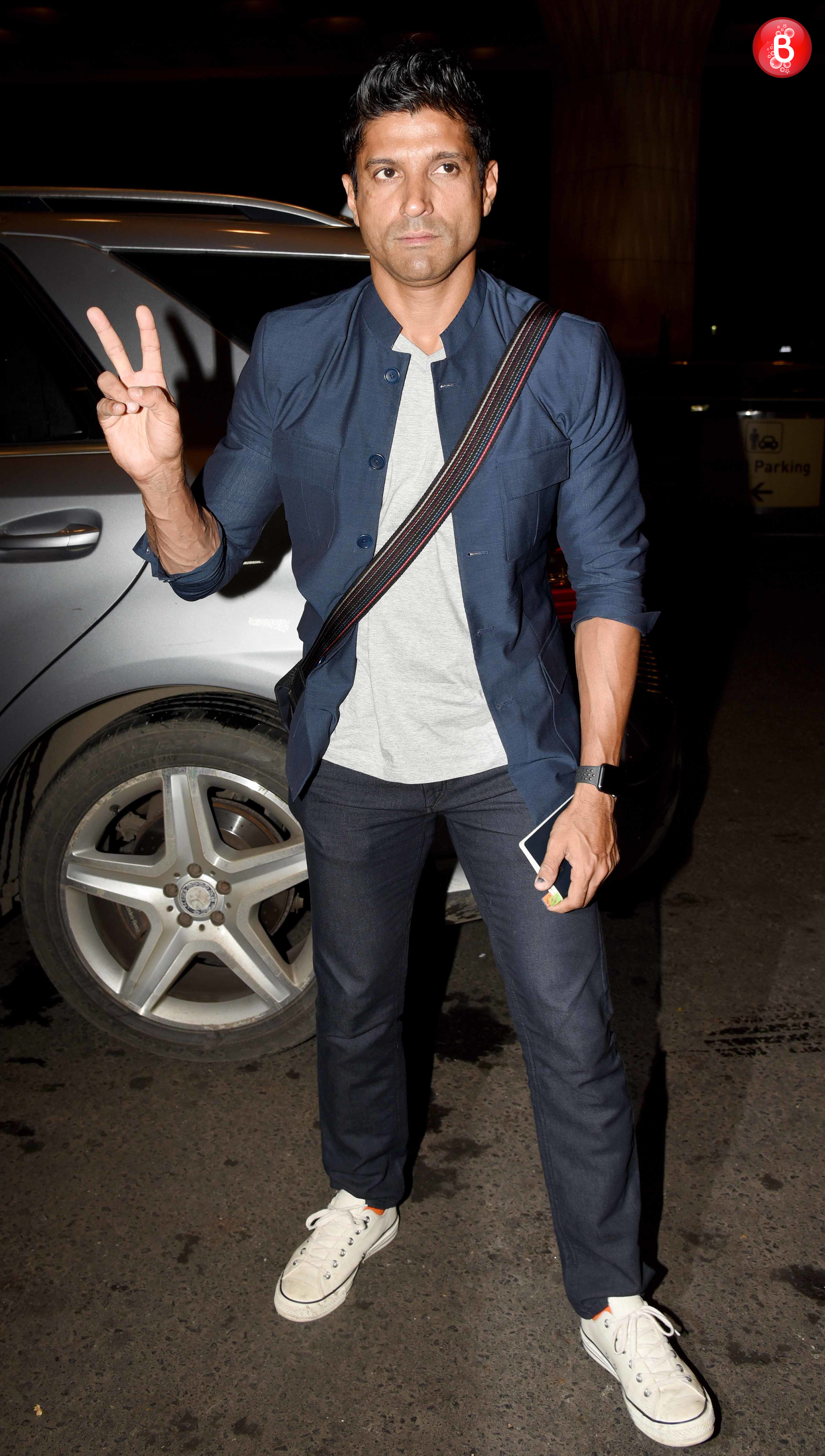 The actor made an entry at the airport dressed in cool grey pants, white tee and a blue semi-formal formal jacket. He teamed up the outfit with white sneakers, a black watch and a sling bag. While most actors go easy with the hair styling at the airport, Farhan was spotted in neat, gelled hair.