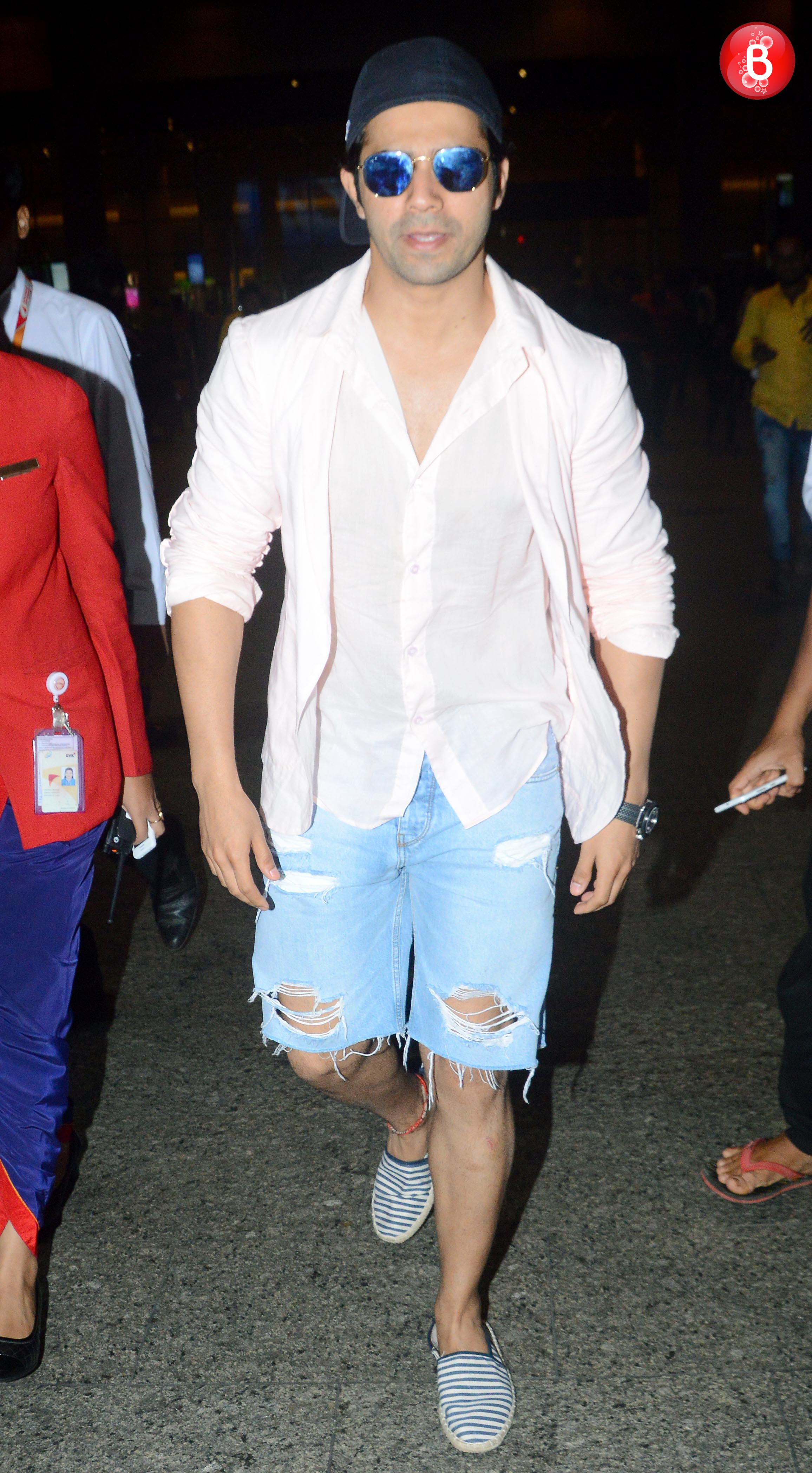 Varun smiled for the shutterbugs at the Mumbai airport and was accompanied by his 'Judwaa 2' leading ladies and father David Dhawan. He looked dapper in ripped knee-length denim shorts, baby pink shirt along with a baby pink blazer (that’s a unique combo). He opted for blue and white slip-ons, black sunglasses and black cap.