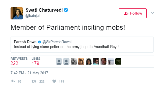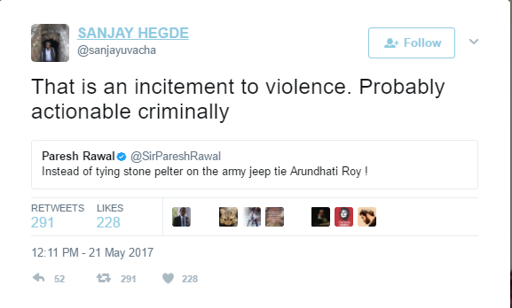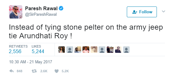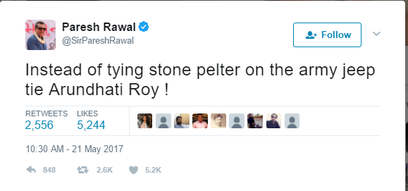 Twitter is a world where everyone can share their opinions, but at times, this platform can become a cause of concern when your thoughts and opinions do not match with the rest. Trolls and critics are always active to put you down and the recent Bollywood celebrity to face the wrath of tweeters is Paresh Rawal. The man, who is know for his comic timing and brilliant performances, is also a political figure. What’s happening in Kashmir concerns all and he recently tweeted about the same. But things went out of control over what he wrote. Paresh Rawal commented on author Arundhati Roy and stated that she should be the one to be tied in front of the army jeep instead of the stone-pelters. Few days ago, a video of a stone-pelter being tied in front of the army jeep and paraded in Kasmir valley had gone viral on the internet.