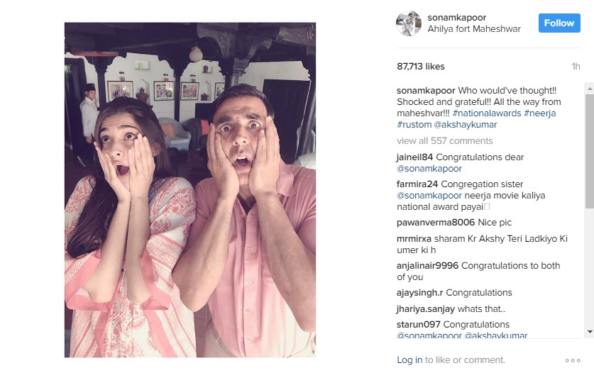 Sonam took to her Instagram account to share this with everyone, writing, “Who would’ve thought!! Shocked and grateful!! All the way from maheshvar!!! #nationalawards #neerja #rustom @akshaykumar.” [sic]