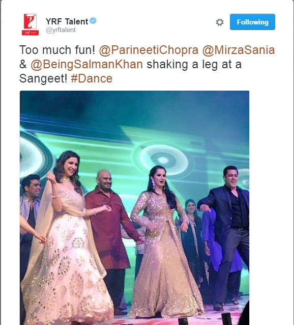 The official Twitter handle of YRF Talent shared the picture, with the caption, “Too much fun! @ParineetiChopra @MirzaSania & @BeingSalmanKhan shaking a leg at a Sangeet! #Dance.” [sic]