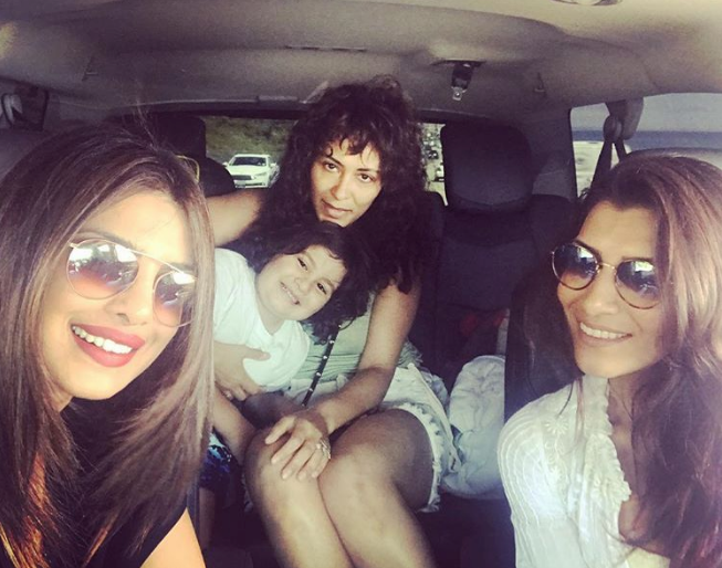 She shared another selfie where she’s sitting in a car with her Quantico gal pal Yasmine Al Massri and a few other friends. She captioned it, “Malibu life! #friendsforlife❤@mubinarattonsey @jazmasri #liam #carfie.” We are so curious about what Priyanka’s wearing (is it the same black outfit?). But doesn’t she still look pretty with that neatly done middle-parted hair left open and a tinge of matte rust colour on the lips? And who’s that chubby cherub in the picture? We want to just gobble him up!