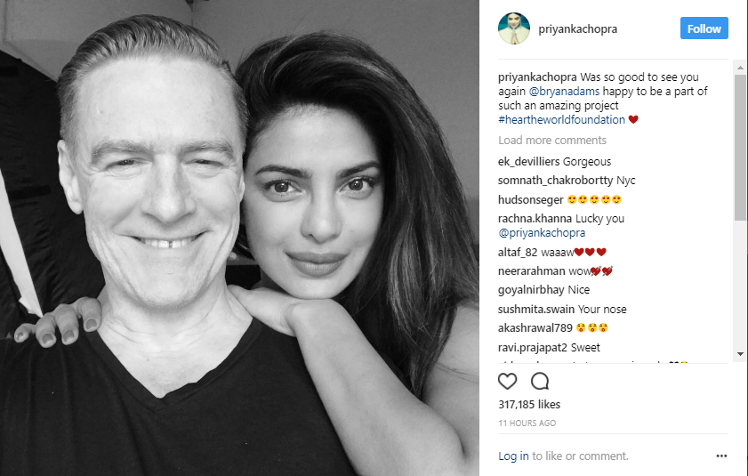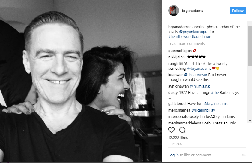Bryan Adams too posted a candid picture shared with Priyanka and captioned it, “Shooting photos today of the lovely @priyankachopra for #heartheworldfoundation.” [sic]