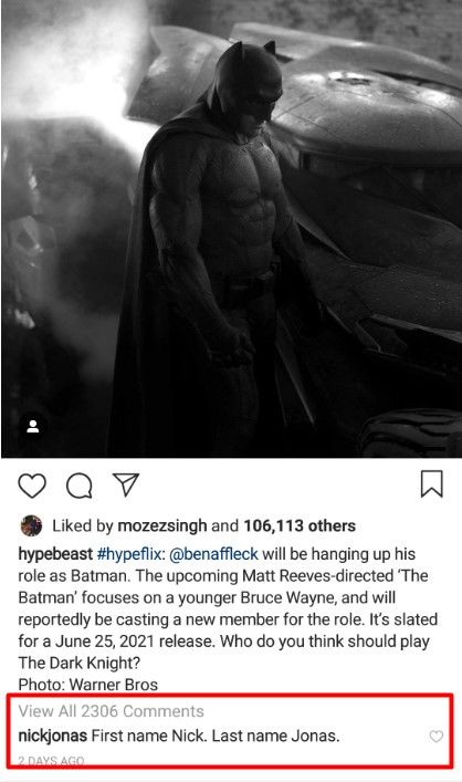 Nick Jonas, without wasting any time offered to play Batman by commenting on Hype Beast’s post. You can check out his comment below: